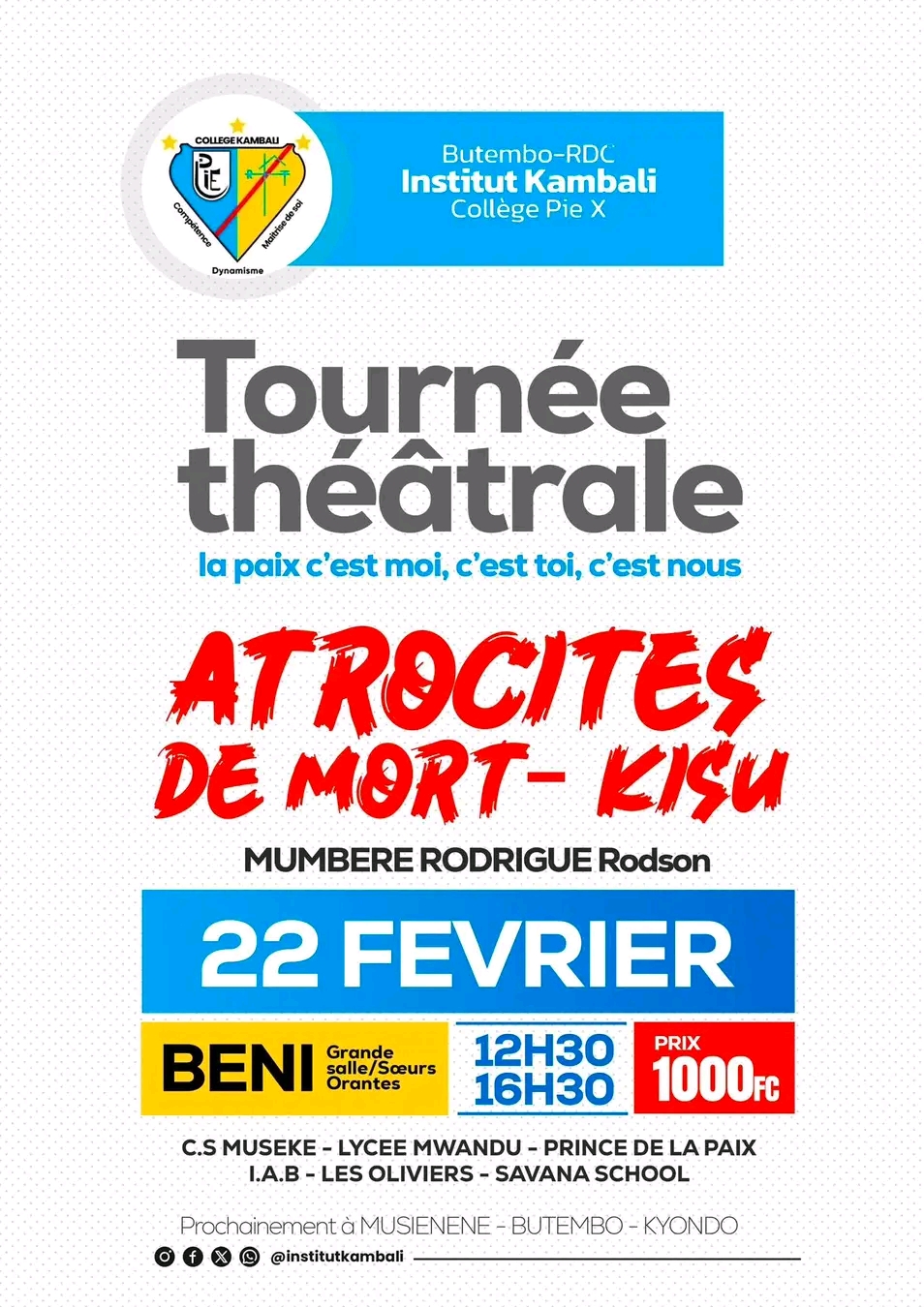 La ville de Beni accueille, ce dimanche 22 février 2026,une présentation théâtrale organisée par l’institut Kambali (Collège Pie X), autour du thème : « La paix, c’est moi, c’est toi, c’est nous. »