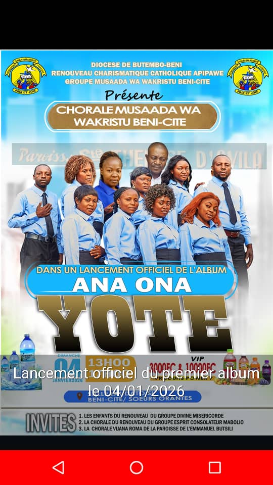 La chorale Msaada Wa Wakristu du Renouveau Charismatique Catholique Apipawe de Beni-Cité annonce le lancement officiel de son tout premier album intitulé « Ana Ona Yote », une expression swahili qui signifie « Dieu voit tout ». La cérémonie est prévue pour le dimanche 4 janvier 2026 dans la salle Laudato Si, chez les Sœurs Orantes de l’Assomption à Beni.