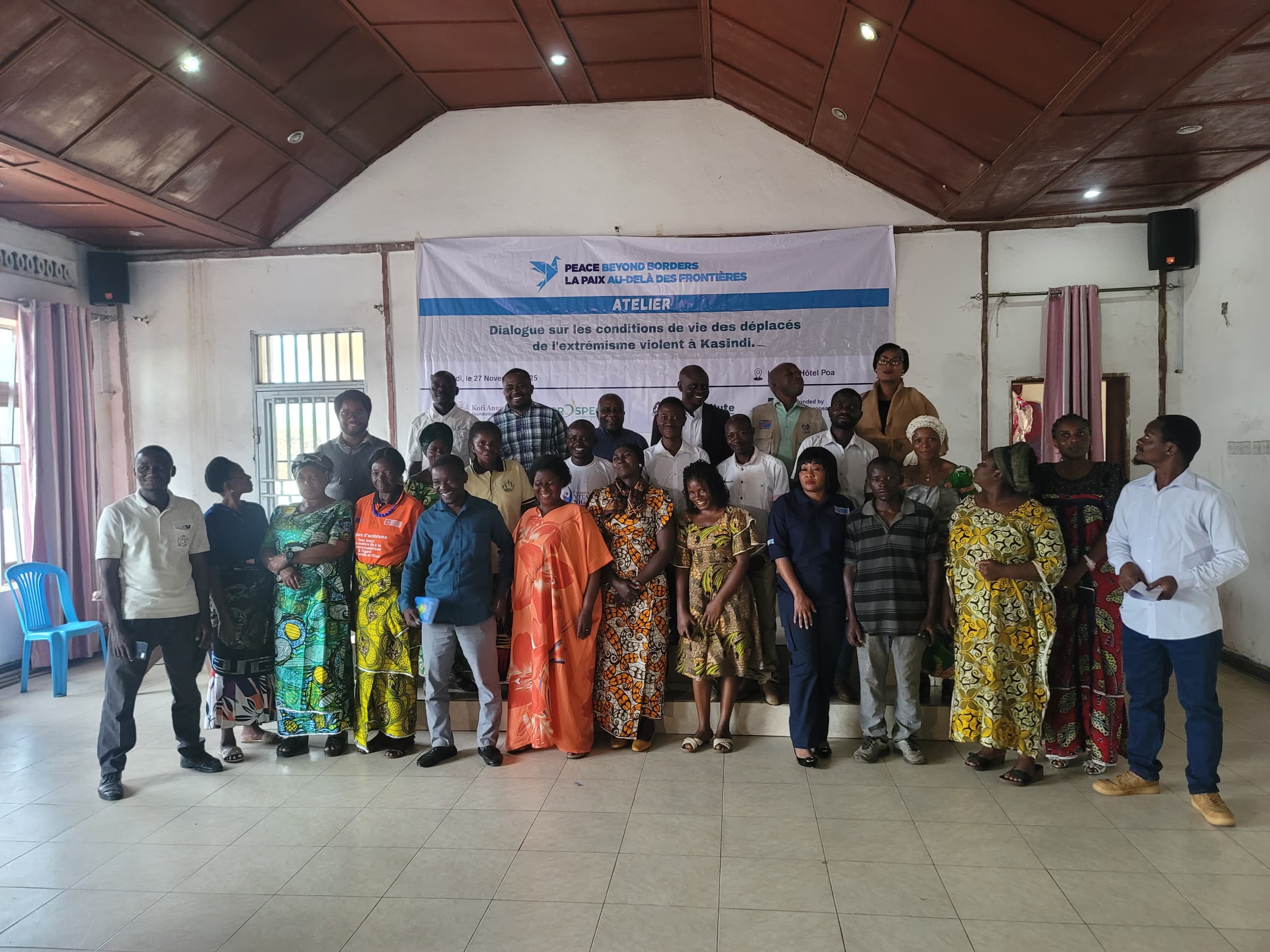 Dans le cadre du projet « Paix au-delà des Frontières » financé par l’Union Européenne et mis en œuvre par le consortium composé des organisation KOFFI ANAN FOUNDATION, PROPECT en Ouganda et Pole Institute en RDC, un échantillon représentatif de déplacés et autres victimes de l’extrémisme violent et leurs familles d’accueil vivant dans la cité frontalière de Kasindi à Beni au Nord-Kivu ont échangé, jeudi 27 novembre 2025, autour de leurs conditions de vie.